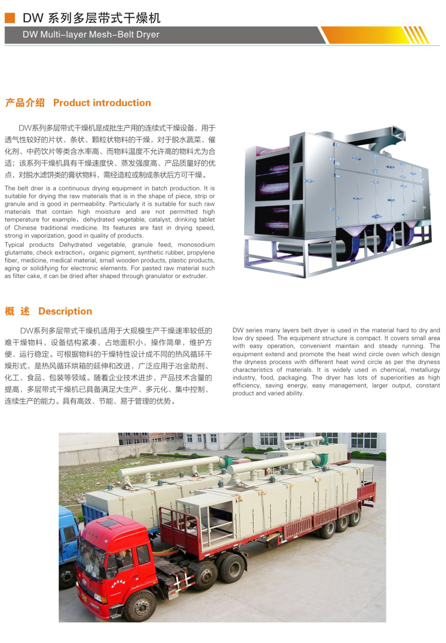 DW系列多層帶式干燥機是成批生產用的連續式干燥設備,用于透氣性較好的片狀、條狀、顆粒狀物料的干燥,對于脫水蔬菜、催化劑、中藥飲片等類含水率高、而溫度不允許高的物料尤為合適;該系列干燥機具有干燥速度快、蒸發強度高、產品質量好的優點,對脫水濾餅狀的膏狀物料,需經造粒或制成條狀后方可干燥。