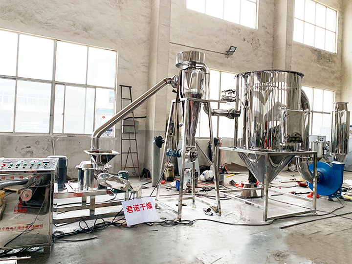 物料通過投料口進入柱形粉碎室,被沿著研磨軌做圓周運動的研磨輪碾壓、剪切而實現(xiàn)粉碎。被粉碎的物料通過風機引起的負壓氣流帶出粉碎室,進入物料收集系統(tǒng),經(jīng)過濾袋過濾,空氣被排出,物料、粉塵被收集,完成粉碎。