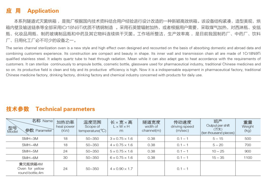SMH系列隧道滅菌烘箱產(chǎn)品,廣泛應(yīng)用于制藥生產(chǎn)的各種安瓿瓶、易拉瓶、西林瓶及其它玻璃容器的干燥、滅菌,亦可以供化工、食品、電子行業(yè)等工業(yè)部門(mén)的物料烘干之用。